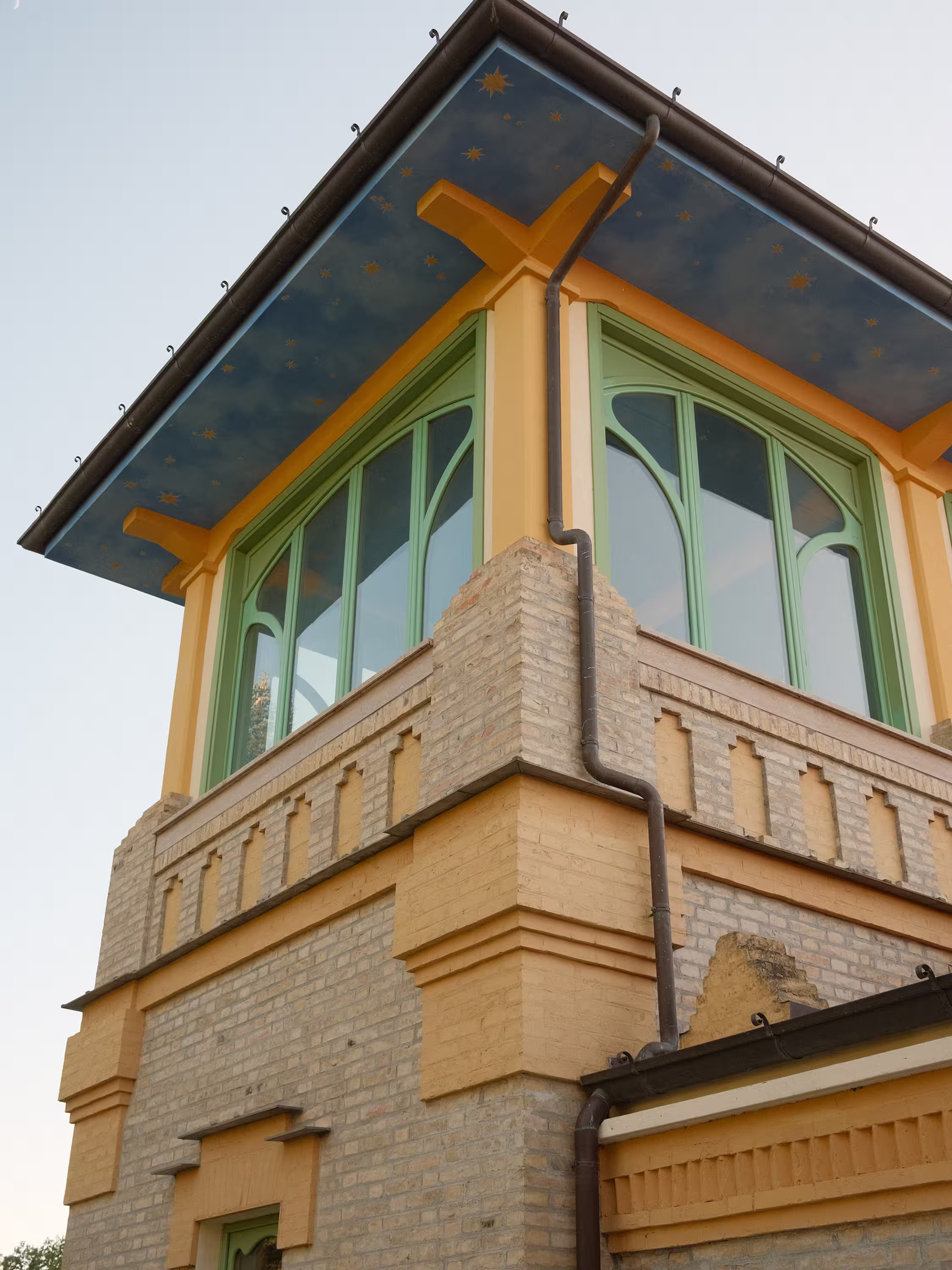 La torretta, elemento tipico dello stile Liberty, è stata riportata al suo colore originario e custodisce oggi un soffitto a cielo stellato, ripreso e riportato al suo splendore, come una finestra sull’universo infinito.